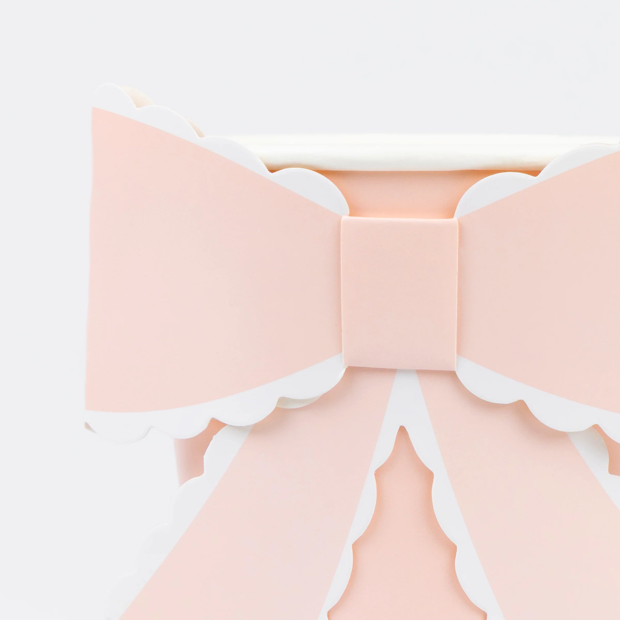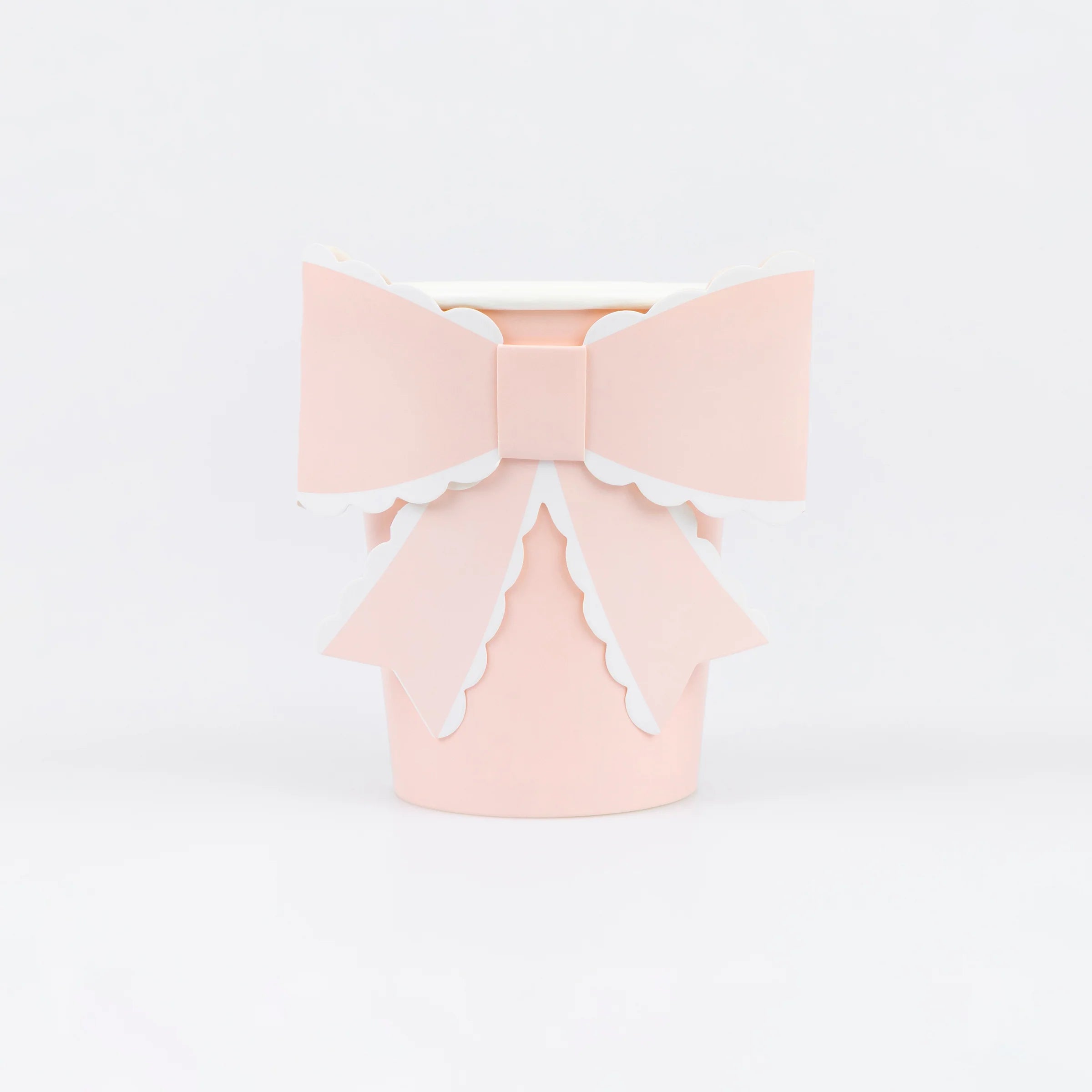 המארז כולל 4 כוסות ורודות ו-4 לבנות, כשכל אחת מהן מעוטרת בפפיון תלת-ממדי בעל שוליים מעוגלים (Scalloped) בגוונים תואמים, למראה הרמוני ויוקרתי.