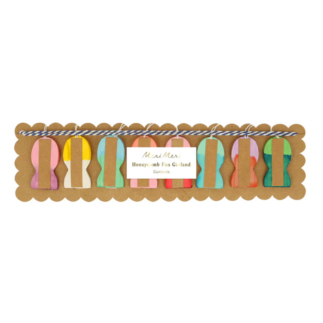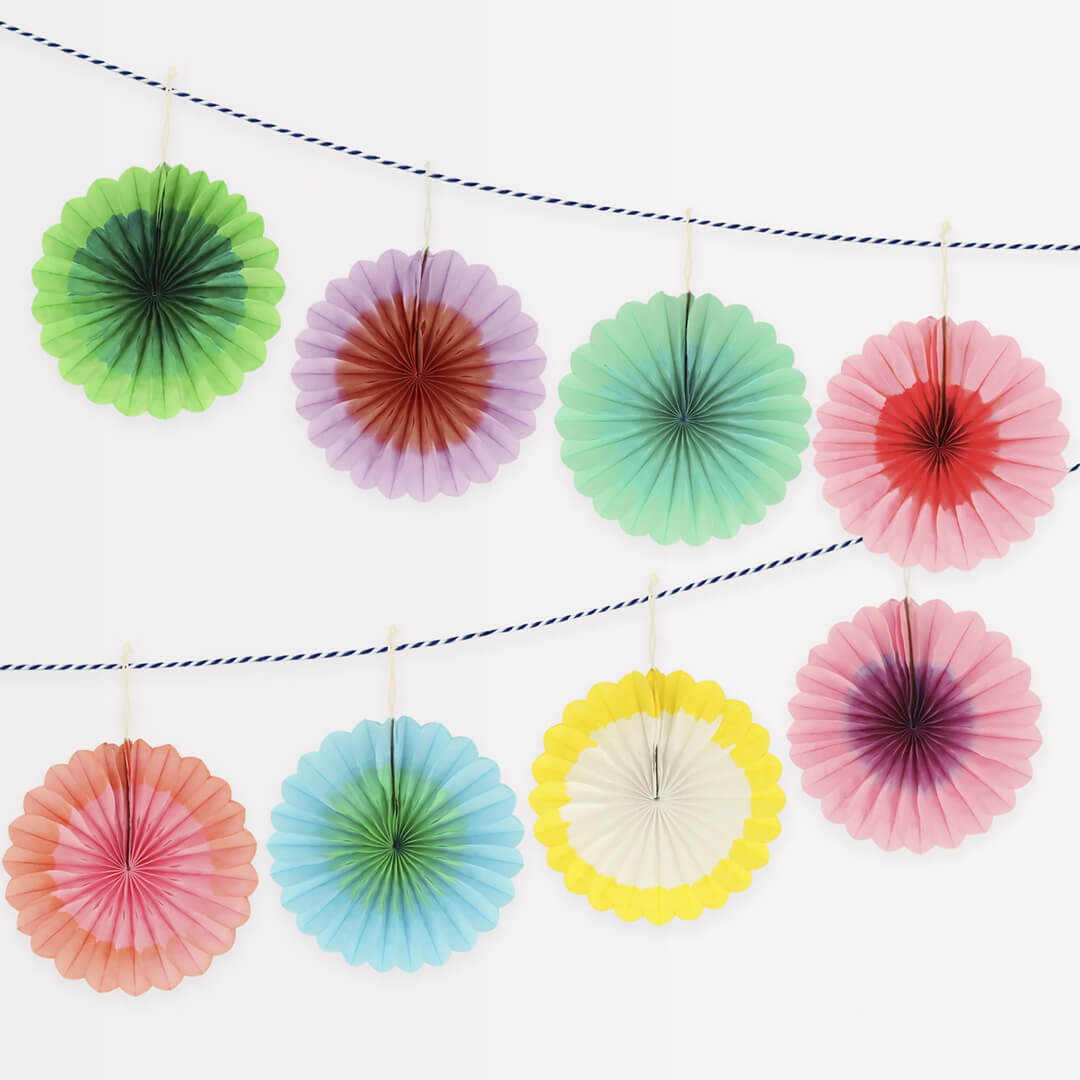 שרשרת מניפות קטנות וצבעוניות תלויות על חוט איכרים