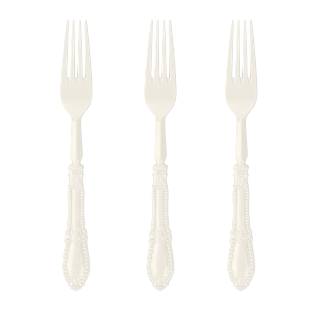 הוסיפו נגיעה אלגנטית לכל שולחן עם מזלגות וינטג' בצבע קרם איכותיים. המזלגות עשויים מחומר חזק ועמיד, בעיצוב קלאסי ומרשים המתאים לכל סוג אירוע