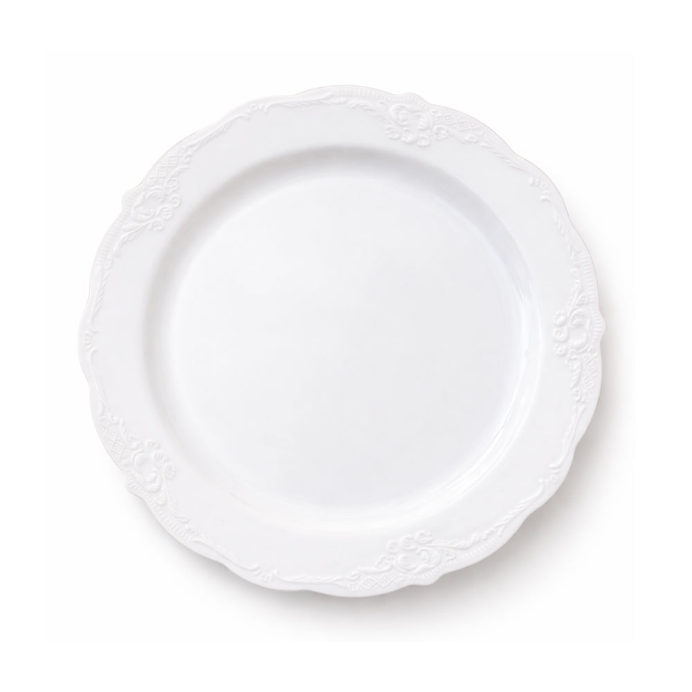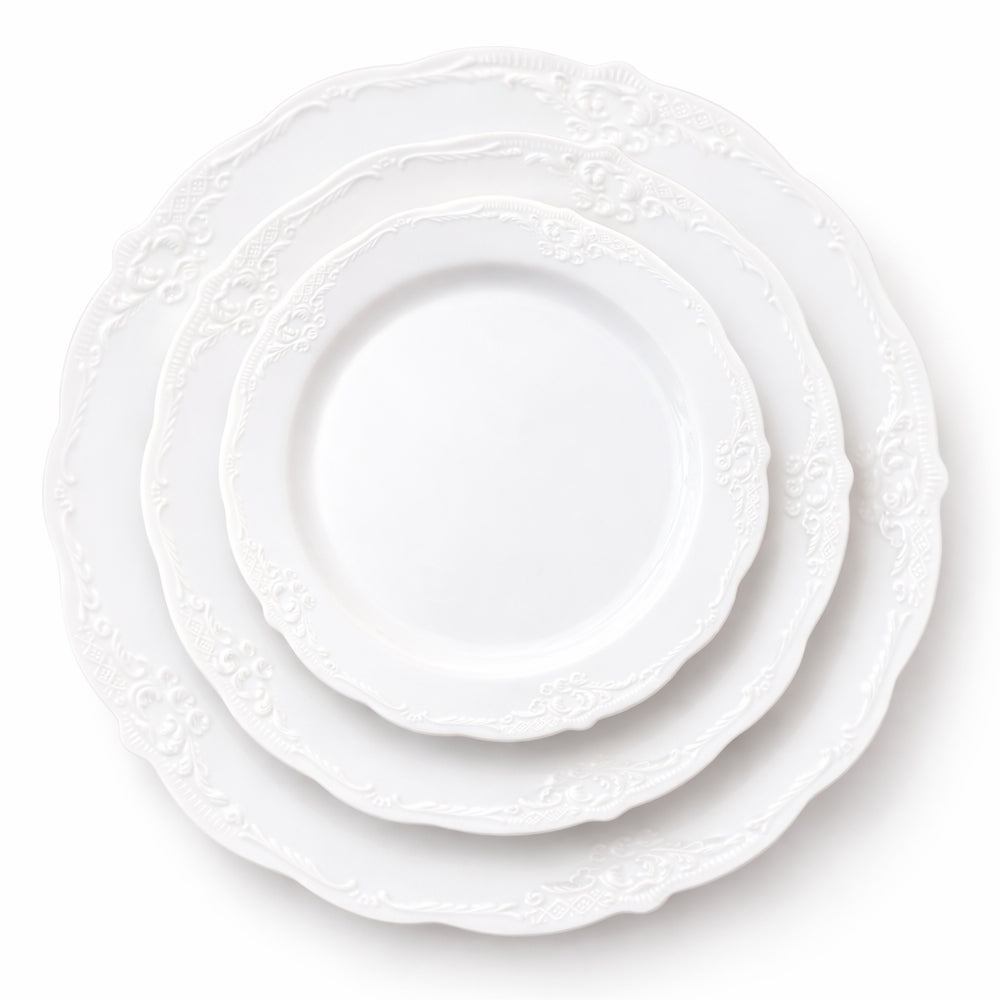 צרו שולחן אירוח מרשים עם סט צלחות בסגנון וינטאג׳ קלאסי בצבע לבן. הצלחות מעוצבות עם הבלטות עדינות ודוגמאות אלגנטיות, ומגיעות במגוון גדלים – למנה ראשונה, עיקרית וקינוח.