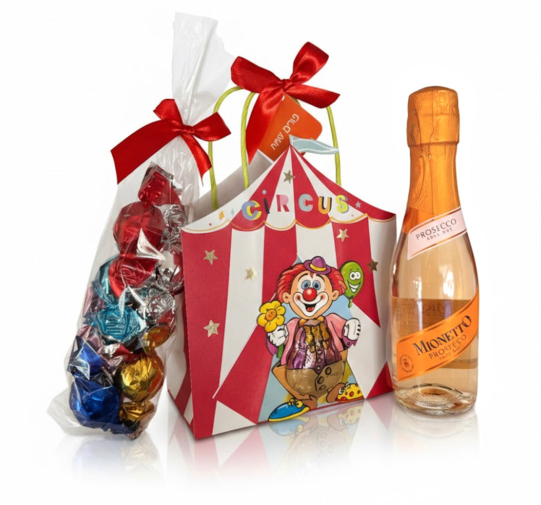 הכניסו את הקסם של הקרקס למשלוח המנות שלכם עם מארז יוקרתי ומעוצב, שנבנה במיוחד עבור מבוגרים שרוצים לחגוג את פורים בסטייל. המארז משלב בין אווירת חג שמחה לבין טעמים משובחים ואיכותיים, הכל בתוך שקית הפתעה מהממת בעיצוב אוהל קרקס קלאסי עם נגיעות של כוכבי זהב.