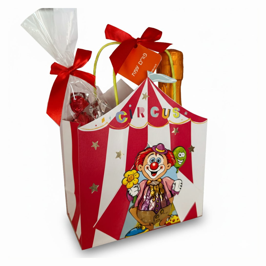 שקית מעצבים "CIRCUS": שקית קרטון איכותית בצורת אוהל קרקס עם ידיות נשיאה מעוטר בכיתוב "פורים שמח" וסרטי קטיפה אדומים.