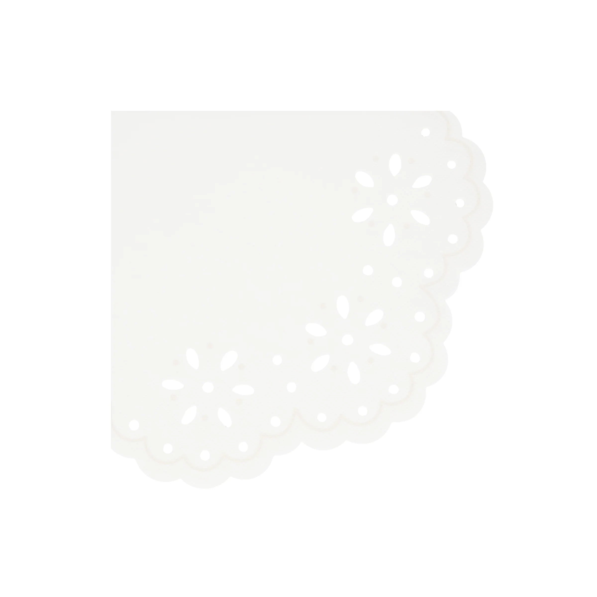 המארז כולל 16 מפיות נייר גדולות בצבע לבן עם הטבעות עדינות בהשראת תחרת Broderie Anglaise ושוליים מסולסלים.