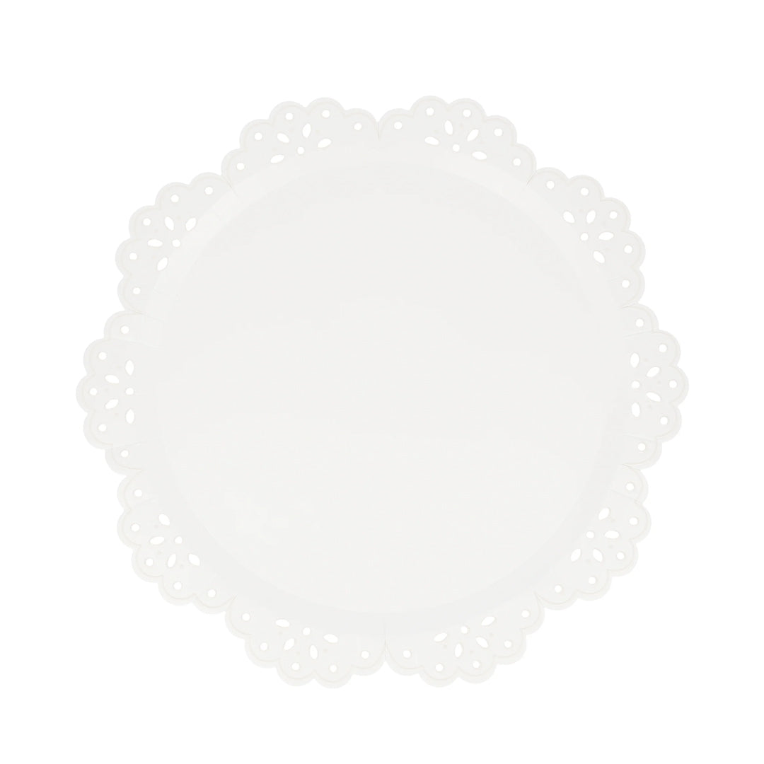 צלחות קטנות ומעוצבות של תחרה לבנה עם שוליים עגולים