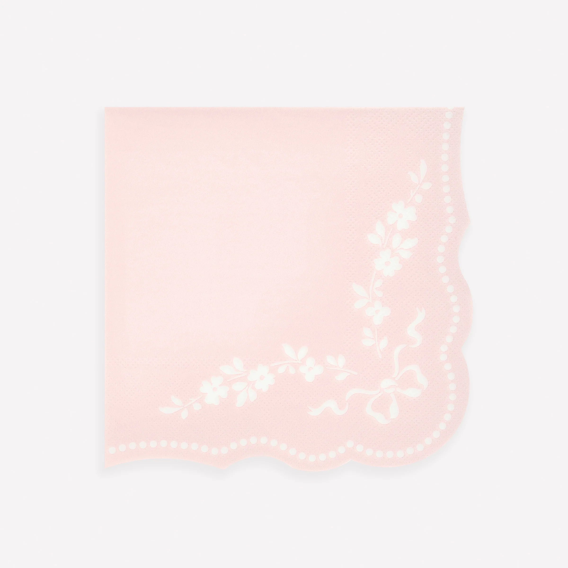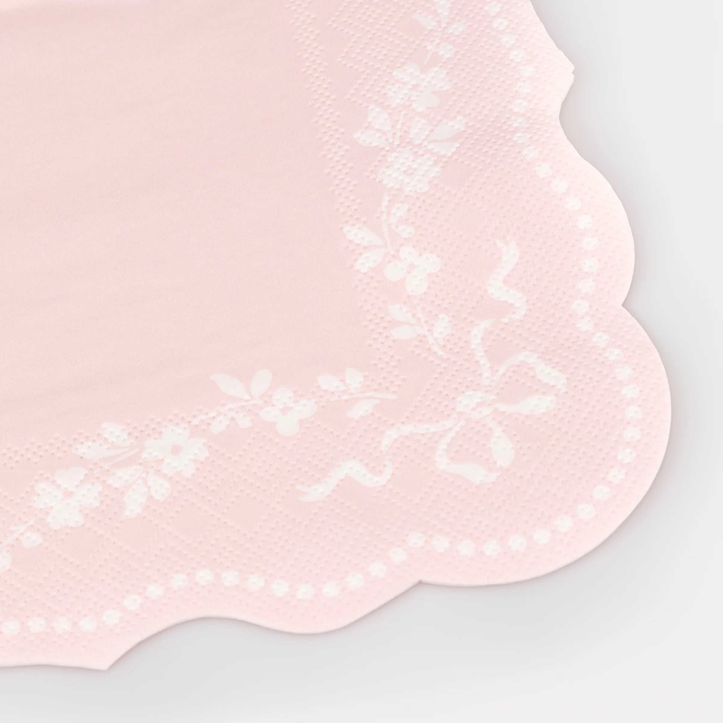 מפיות נייר גדולות בצבע ורוד פסטל עם דוגמת רוקוקו אלגנטית ושוליים גליים מעוטרים – מושלמות לאירוח פסח חגיגי, מסיבת תה, בייבי שאוור או מסיבת כלה.