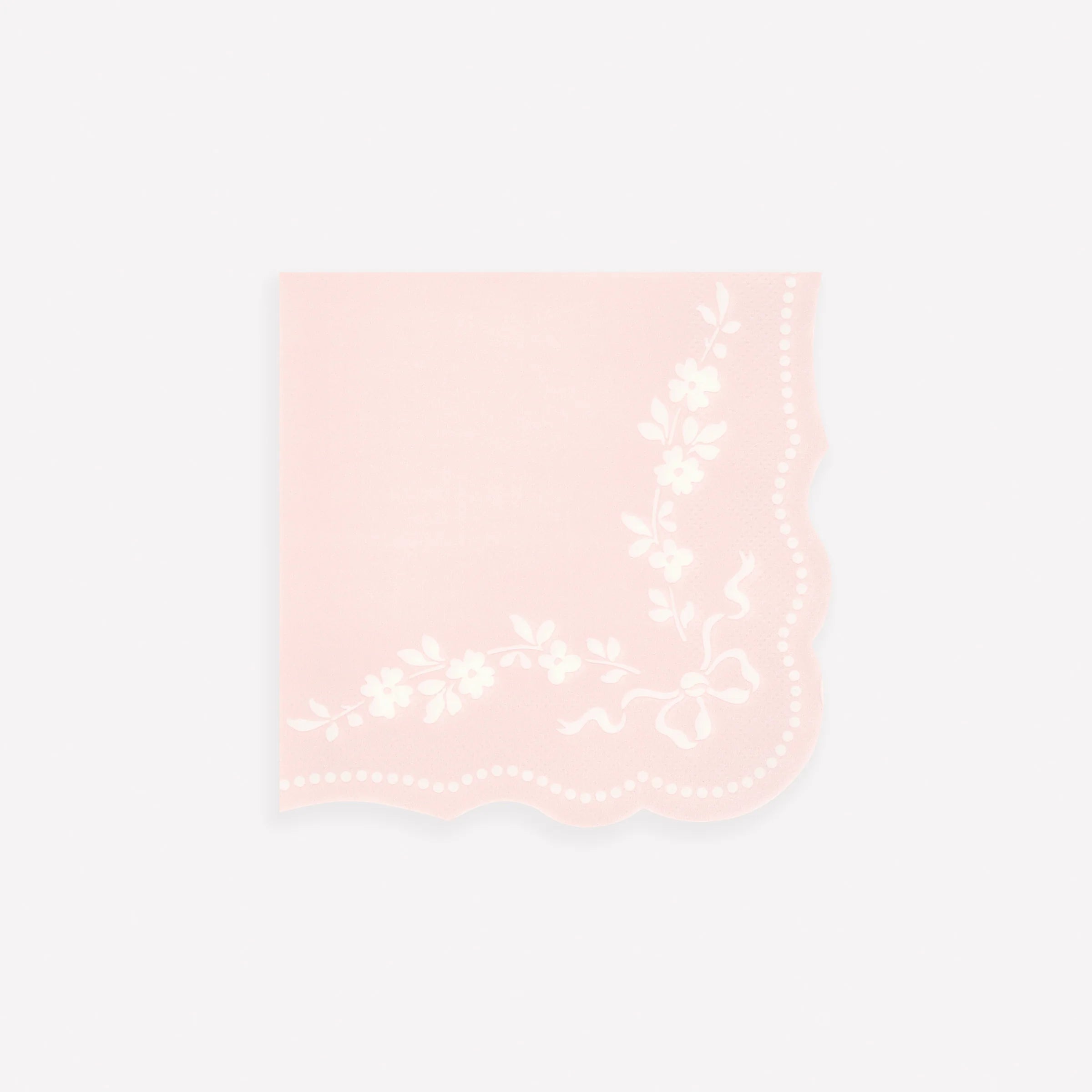 המארז כולל 16 מפיות נייר גדולות בצבע ורוד פסטל עם דוגמת רוקוקו לבנה ושוליים גליים מעוטרים.