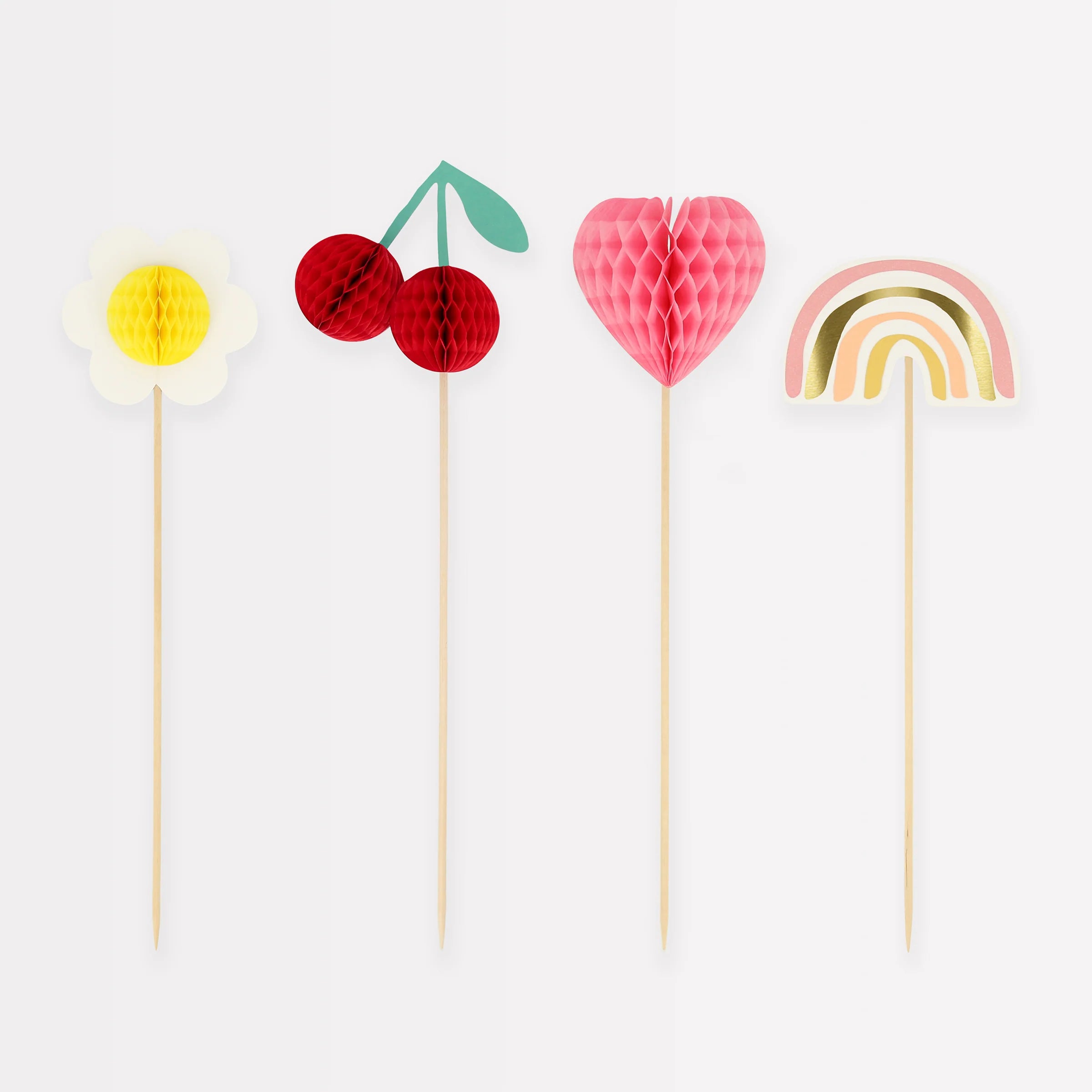 טופרים גדולים ומרשימים שישדרגו כל עוגה ברגע! העיצובים של פרחים, דובדבנים, קשתות ולבבות שואבים השראה משנות ה־90 ומעניקים מראה צבעוני, שמח וכיפי – מושלם לימי הולדת, מסיבות וחגיגות מיוחדות.